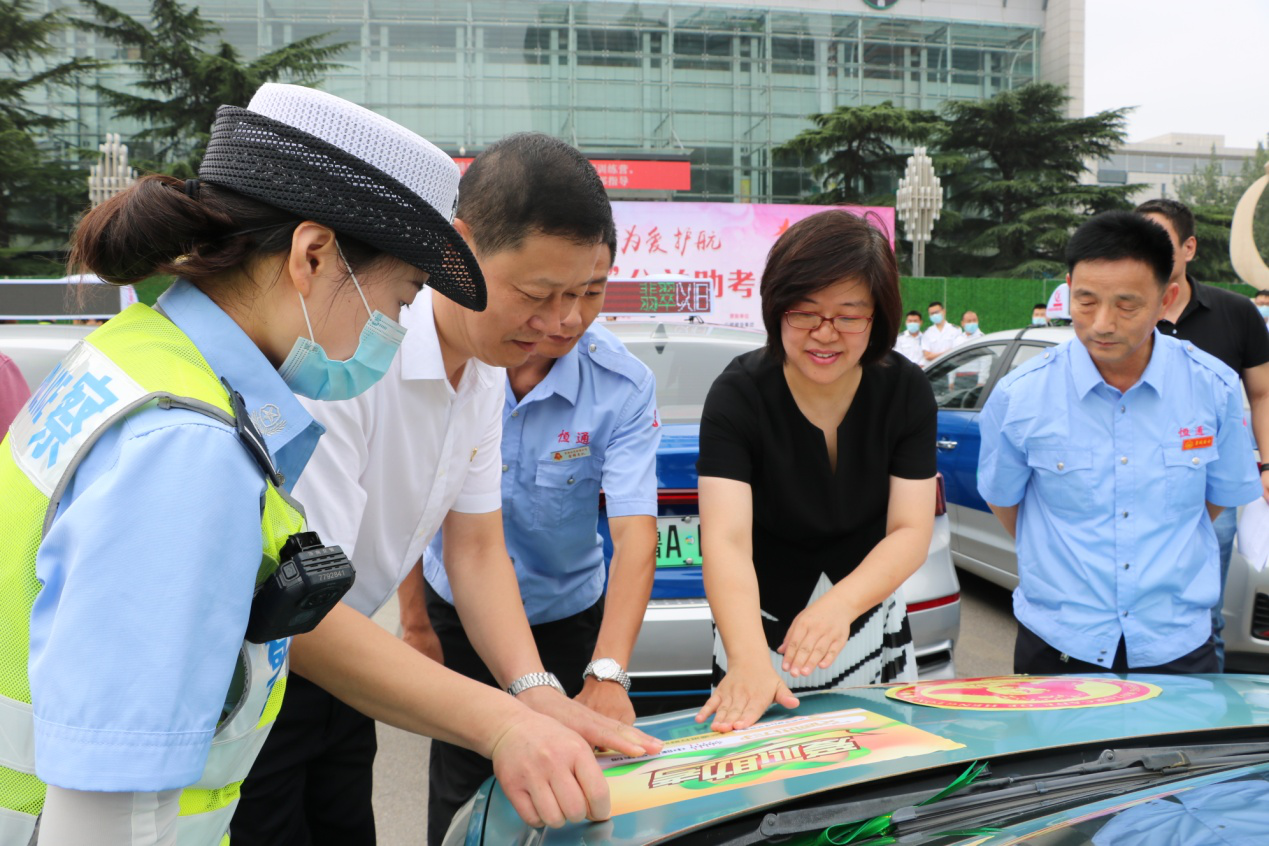 此次助考活動,舉辦方還為愛心助考車輛準備了愛心助考貼和綠絲帶標識。李培鋼董事長與濟南廣播電視臺黨委委員、副臺長許偉、濟南市公安局交警支隊副支隊長趙洪銘等領導一同來到送考車輛前,為助考車輛貼上了愛心助考貼、綁上綠絲帶,標志著愛心助考活動正式啟動。